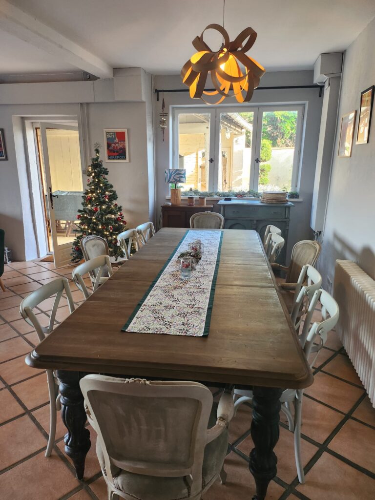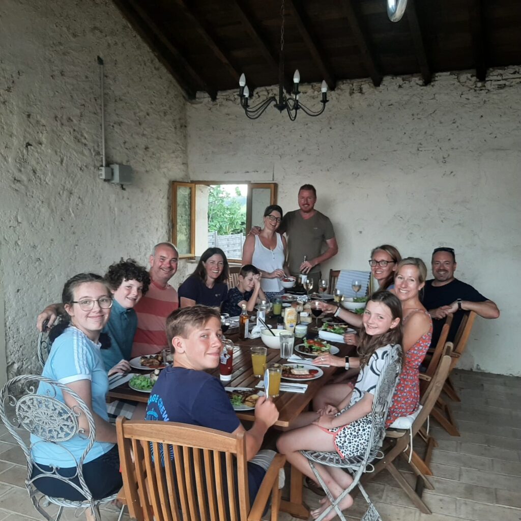 The table in the open barn in the courtyard extends to easily seat 10-12 people. We also have an additional wooden table and chairs that fits comfortably at the end of the main table to seat an extra 4.